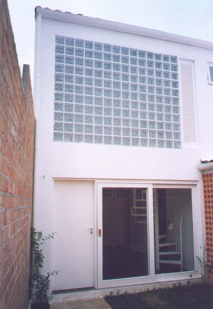 Nessa construção, com uma única face de iluminação, foram montados um programa com estar e copa integradas, lavabo, e área de serviço. Uma escada metálica em caracol da acesso ao mezanino superior, onde se localizam o dormitório e suíte e um closet.